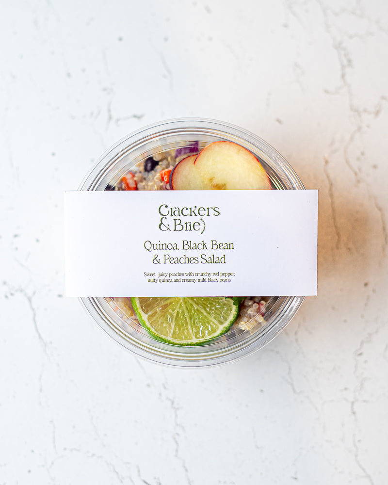 Hearty, fresh and full of feel-good flavour. Fluffy quinoa and protein-rich black beans form the base of this satisfying salad, paired with sweet, juicy peaches for a summery twist. It’s a wholesome, plant-based pot that’s as nourishing as it is delicious — ideal for a light lunch, a healthy side, or a quick grab-and-go graze.